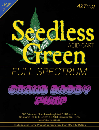 Seedless Green's line up of Full Spectrum CBD Vape Cartridges features a CO2 extracted non-decarboxylated acid base is derived from Full Spectrum Cannabis oil. This full ceramic cartridge boasts of bright botanical terpenes modeled after tried and true cannabis strains and converts into a mild vapor as the device heats the oil.